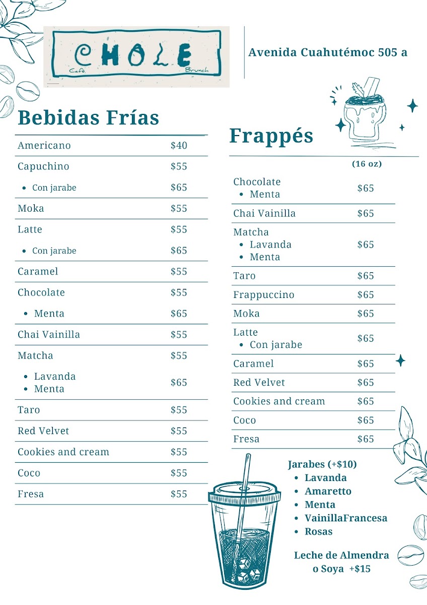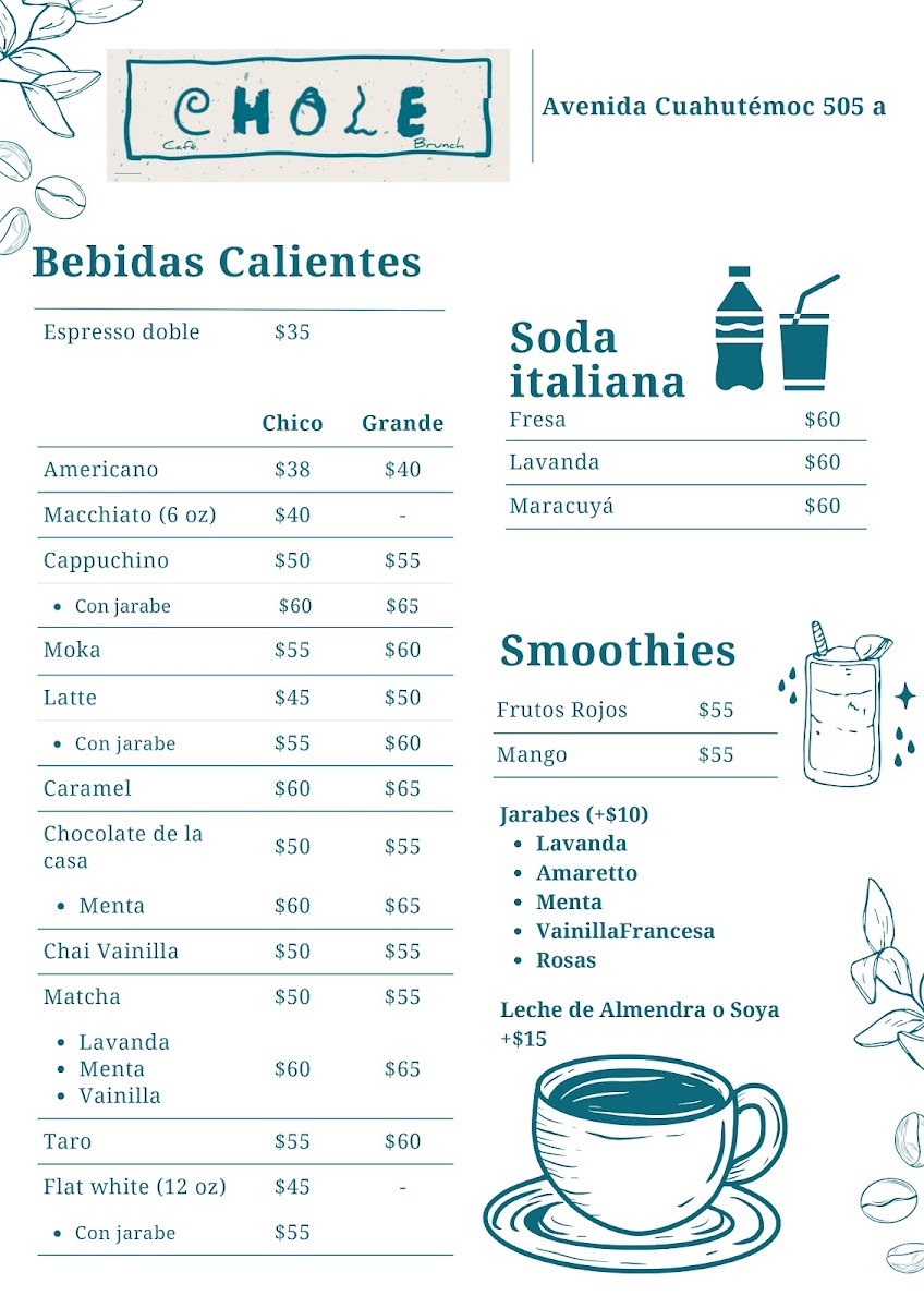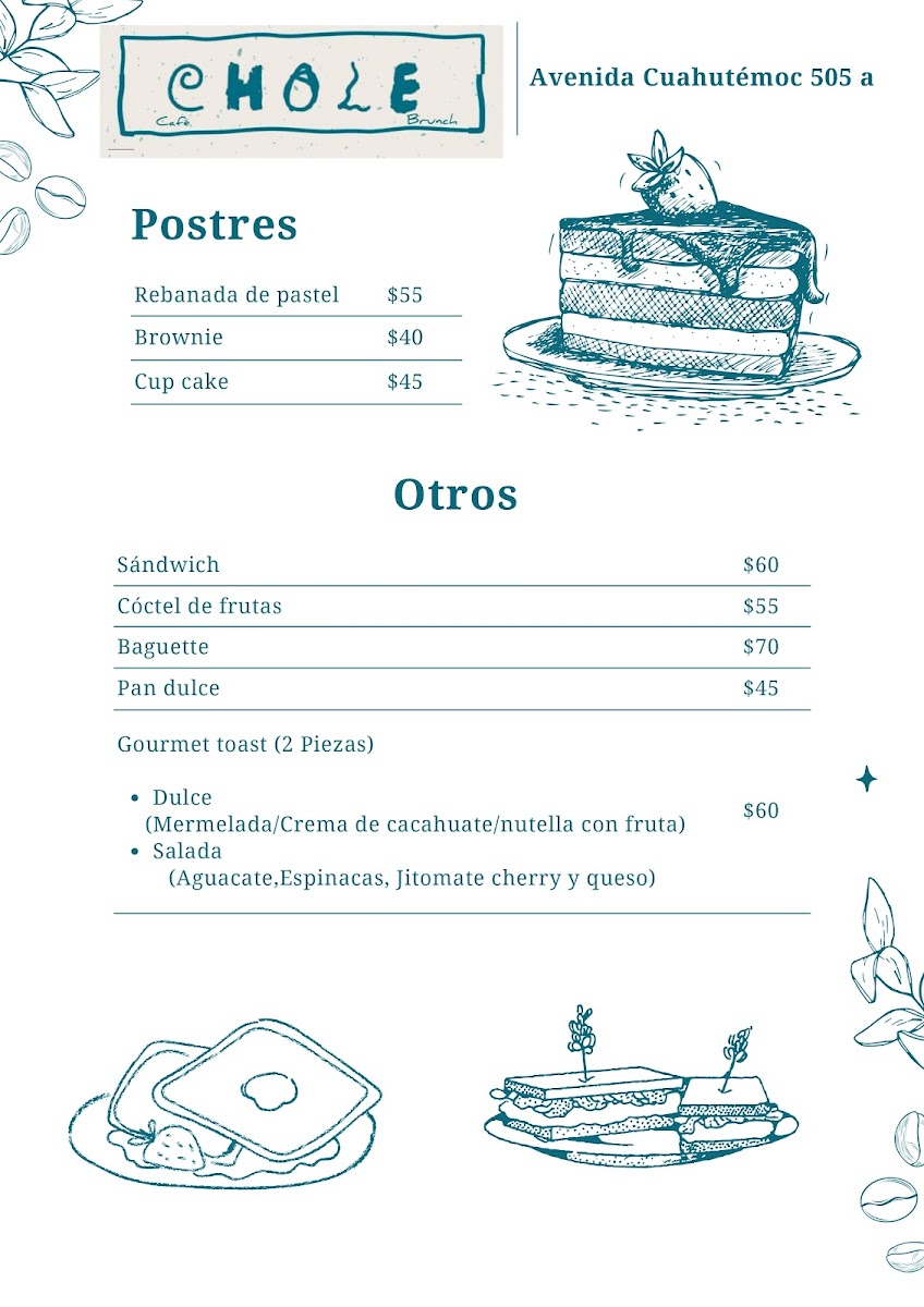 Welcome to Chole Cafe & Brunch, a hidden gem nestled in the heart of San Luis Potosi, specifically at Av. Cuauhtemoc 505A, Las Aguilas 1ra Secc. This charming café invites you into a world where great coffee meets an inviting atmosphere, making it an ideal spot for both relaxation and productivity.